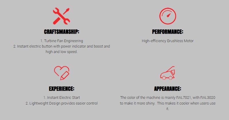 Design della pala della ventola: il design aerodinamico della pala della ventola garantisce un'efficiente guida del flusso d'aria, massimizza la potenza di soffiaggio delle foglie e migliora l'effetto di pulizia.