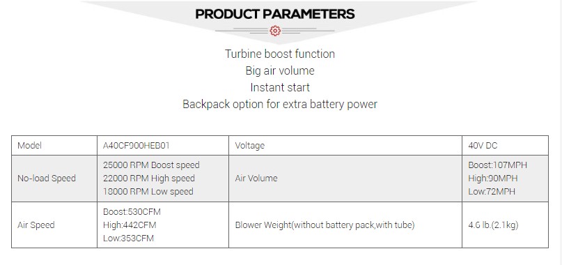 Tecnologia del motore brushless: la funzione turbocompressore del soffiatore per foglie con batteria al litio adotta un'efficiente tecnologia del motore brushless, che aziona la ventola turbo ad alta velocità per generare un forte flusso d'aria.